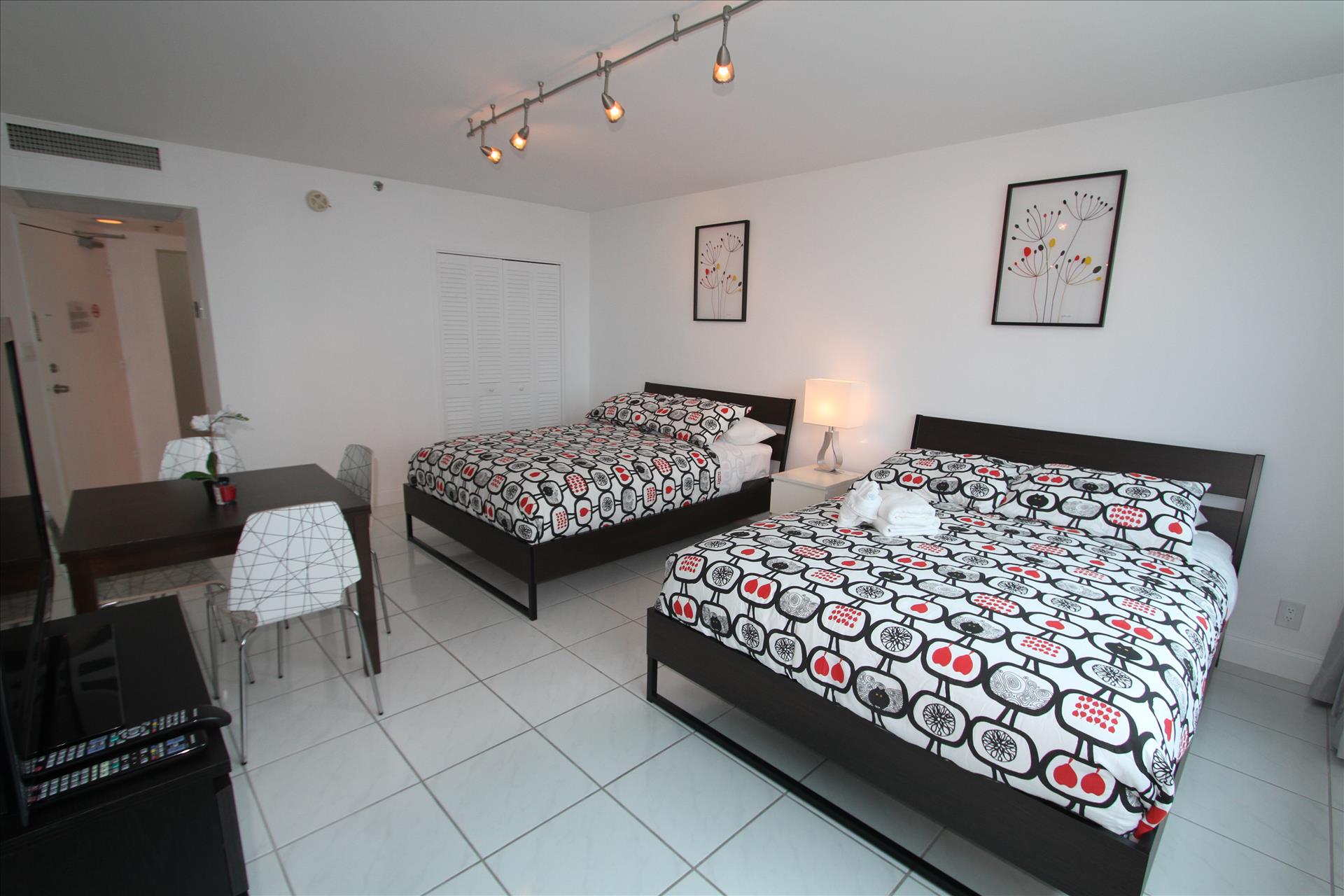 Beach chairs, 1 umbrella and beach towels are inside the room