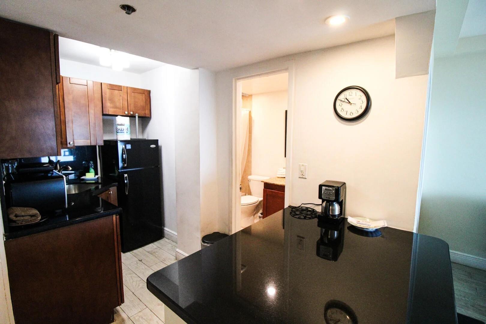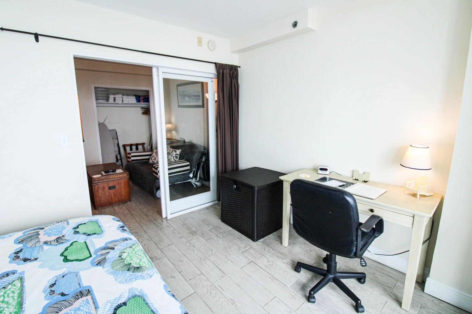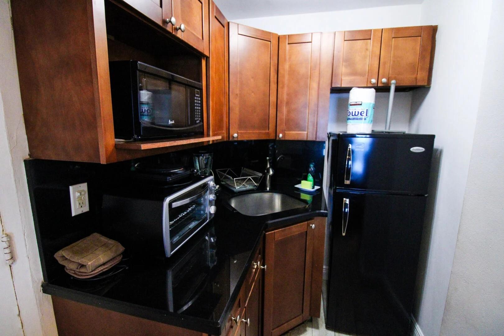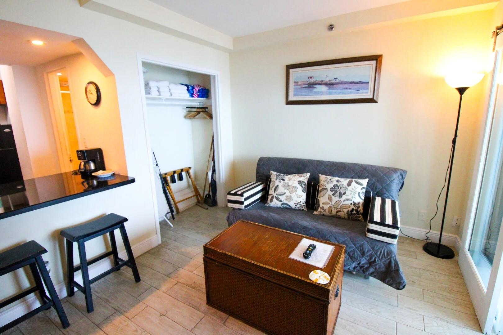 This fully furnished studio has a kitchenette with microwave, toaster oven, coffee pot, and all utensils. Smart Tv with cable and streaming access. One queen bed and a futon for sleeping up to 4 persons. New poo, tiki bar, restaurant, commercial shopping inside the building. Walk to restaurants nearby. Laundry facilities inside the building.